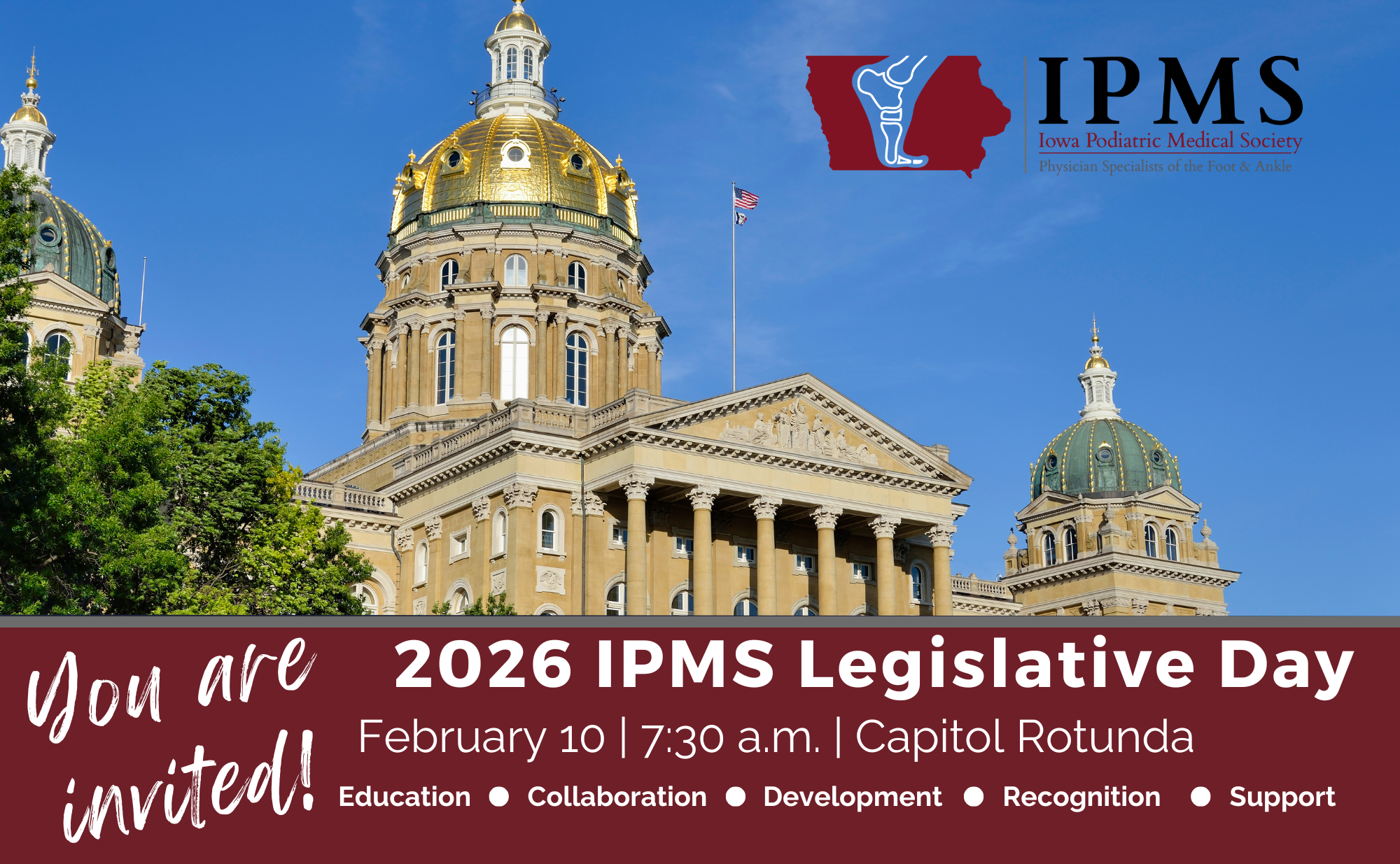 This is your annual opportunity to advocate for the podiatric industry and protect your livelihood! Meet with legislators and fellow IPMS members at the Iowa State Capitol. Tuesday, February 10, 2026 | 7:30 a.m. - 11:00 a.m. Iowa State Capitol | Des Moines, Iowa